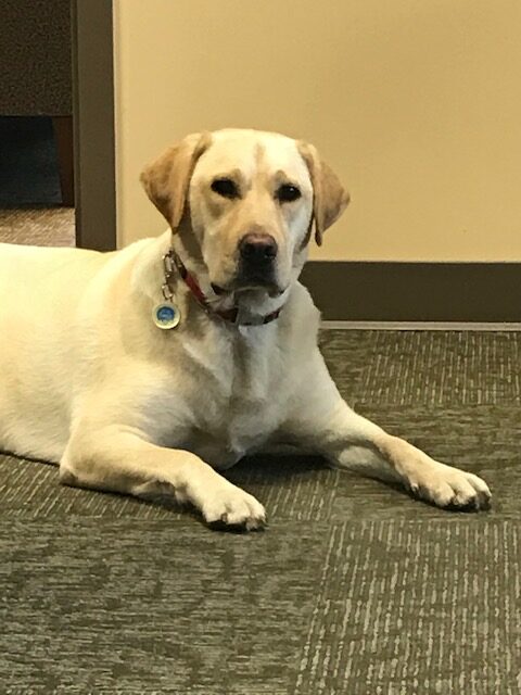Anna is a very smart, yellow, Labrador Retriever who was bred from Hannah’s line. She has a lot of happy energy coupled with a calm and peaceful presence. She earned her American Kennel Club (AKC) Canine Good Citizen certification at four and half months of age. She’s always ready to offer a happy tail wag or cold nosed greeting to anyone at PAS and can be found happily snoozing on anyone’s feet.